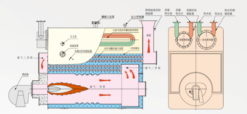 ③熱效益高: 鍋爐燃燒方式為濕背式三回程前煙室結構,煙管采用內外雙螺紋纏繞翅片管,大幅度降低了鍋爐煙室溫度,使鍋爐排煙溫度在120℃左右,內置式熱交換器的換熱管采用獨特的大波節螺紋管結構,提高了效果,鍋爐的整體熱效益大于95%以上。
