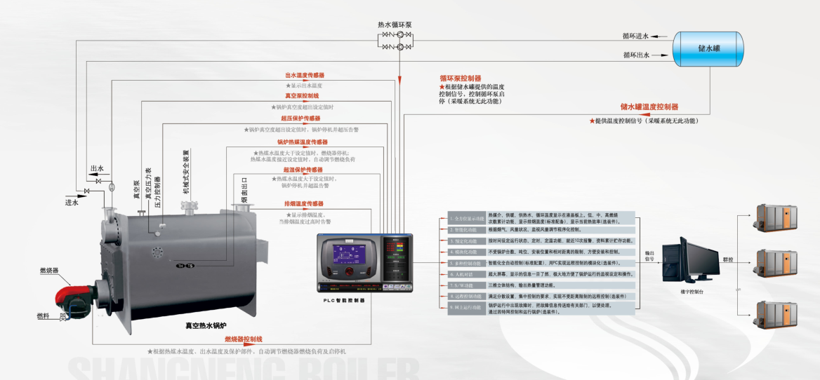 WZK型低氮(NOX<30-50mg/m3)冷凝燃氣真空熱水鍋爐智能化功能介紹: